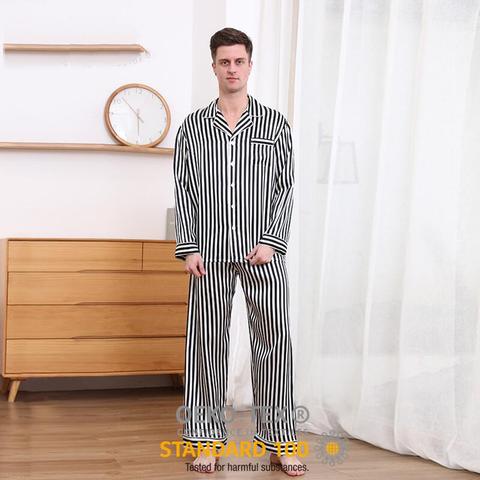 Set pakaian tidur sutra untuk pria, piyama sutra asli garis Zebra bernapas lengan panjang Set pakaian malam sutra murbei kelas 6A